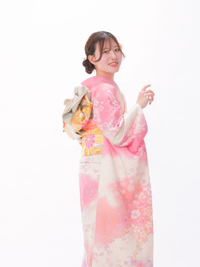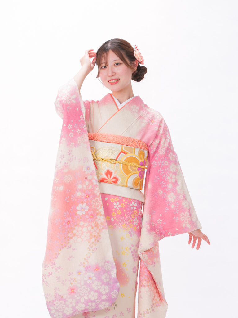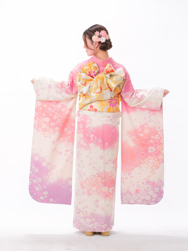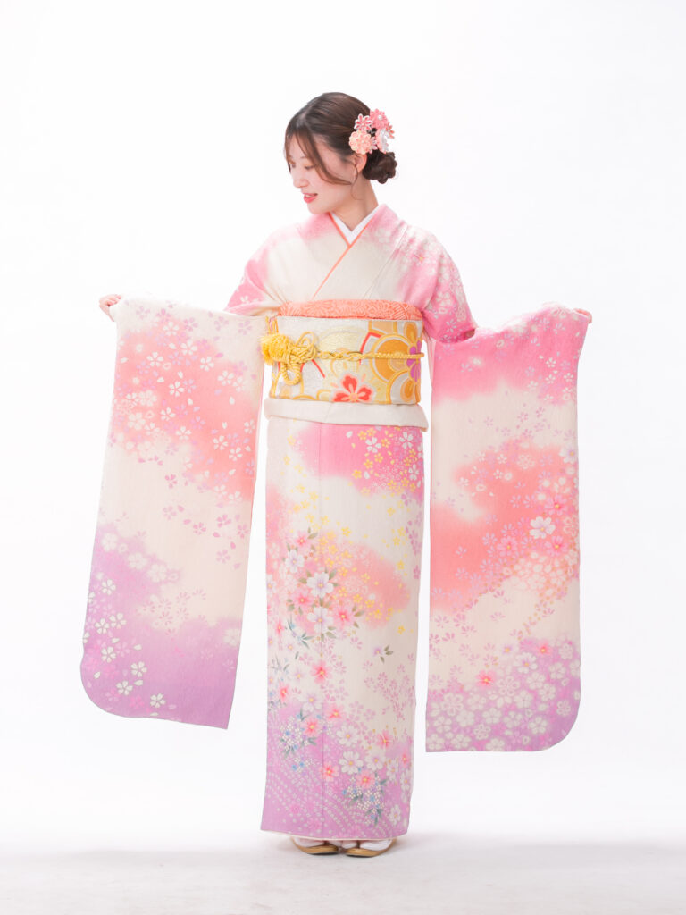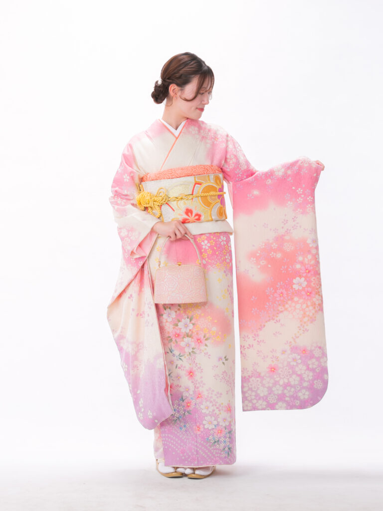 淡色のグラデーションが現代のトレンドである 「透明感」や「可憐さ」を象徴する振袖。 色の境界線がふんわりと馴染むデザインで 着る人を優しく、包み込むような雰囲気に。