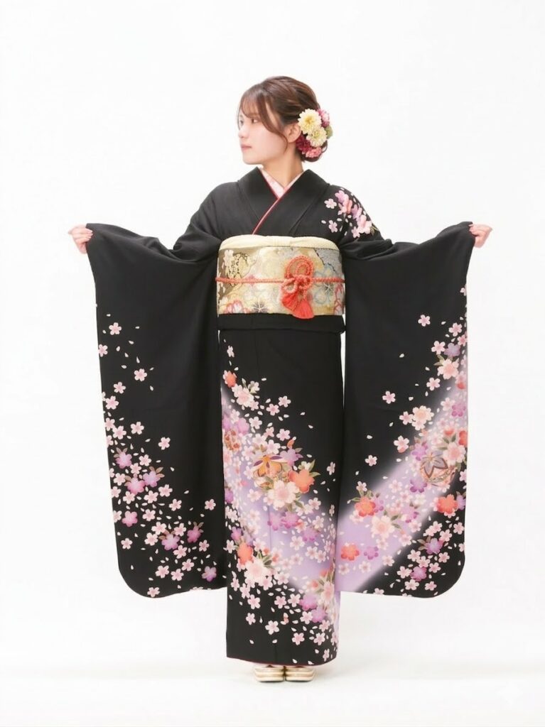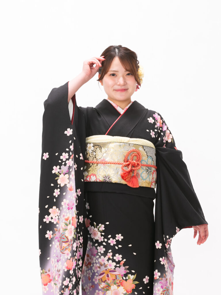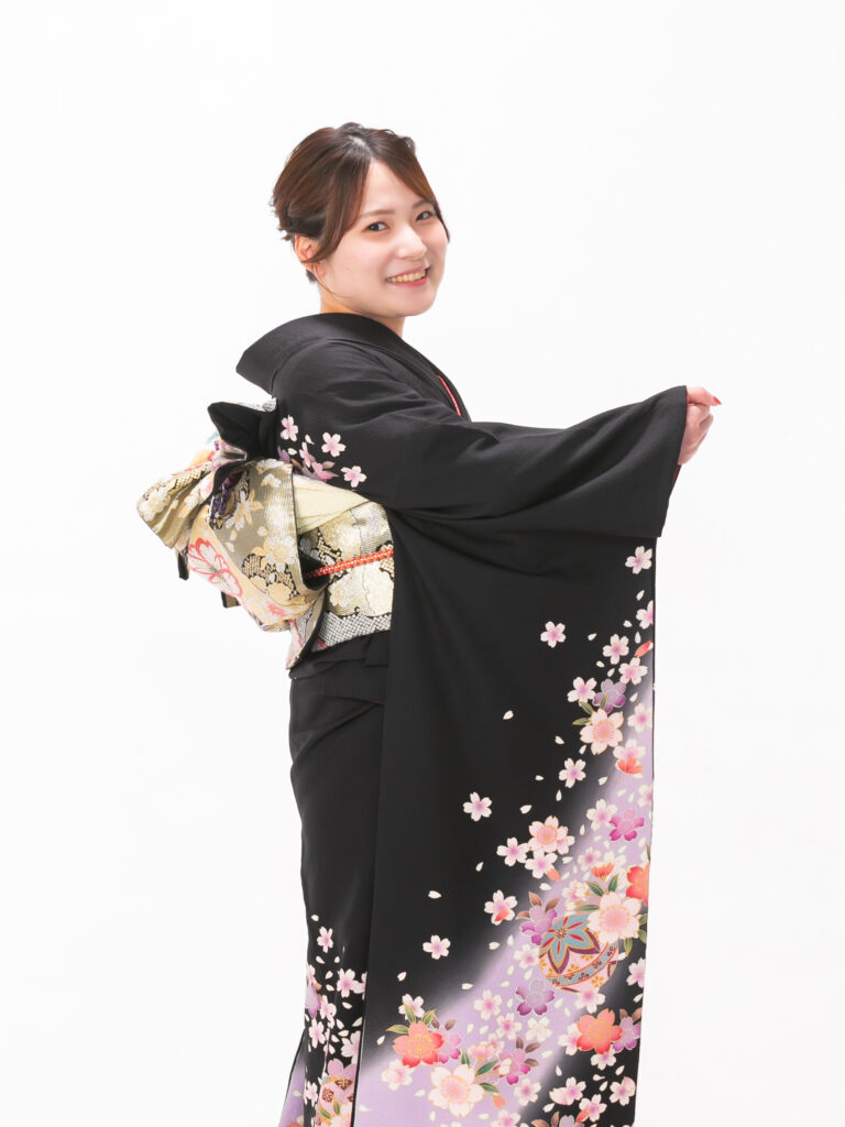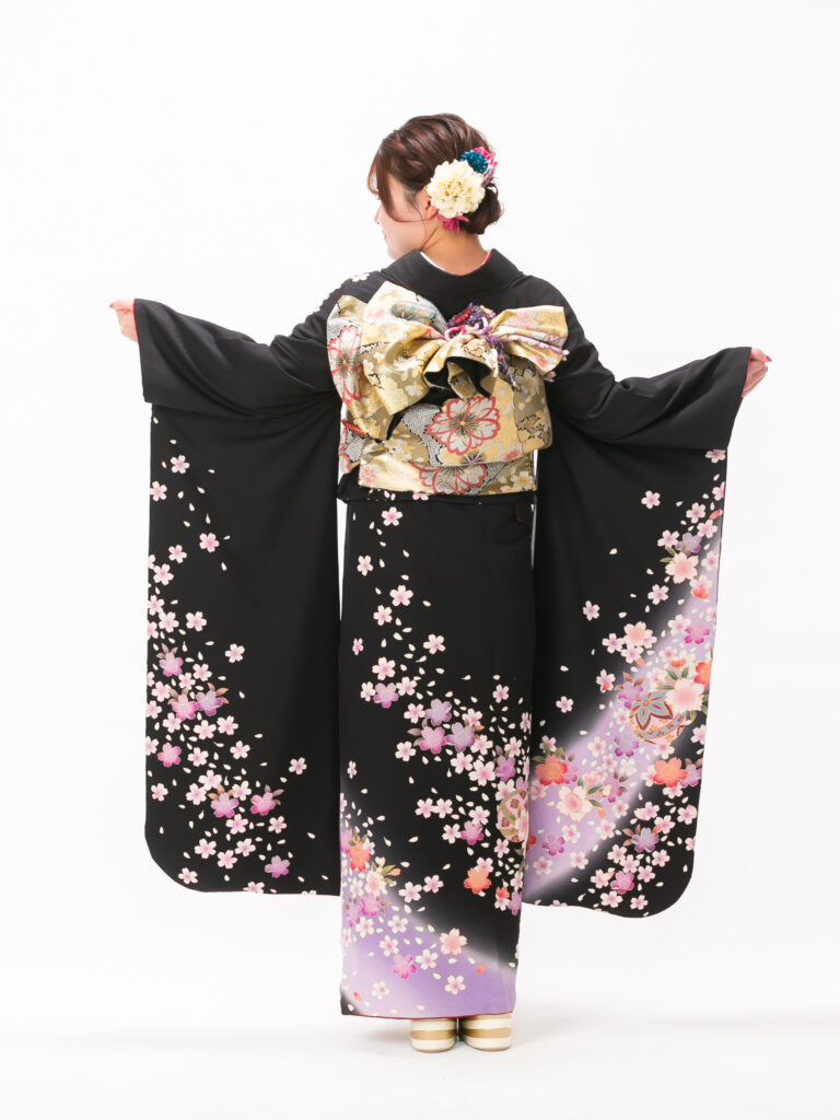 重厚感のある黒地に 高貴な印象を 与える紫のぼかしが美しく映える振袖。 裾に向かって花が密集するデザインは、 立ち姿をより華やかに見せます。
