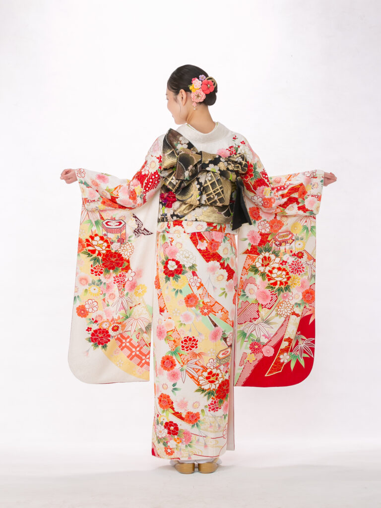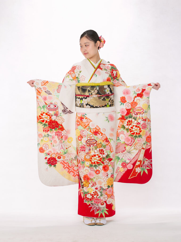 白地に赤の染め分けと鮮やかな花尽くしの柄を 組み合わせた古典的で正統派な振袖。 伝統的な吉祥文様が豊富に用いられ 明るく華やかで幸福感あふれる一着。