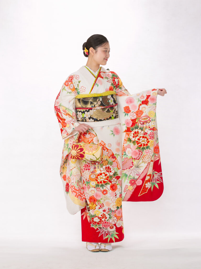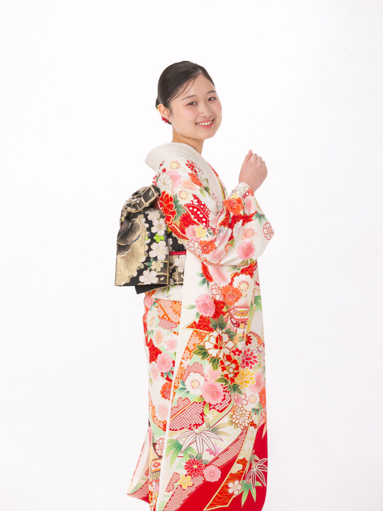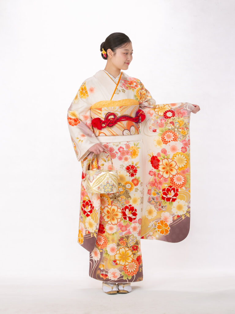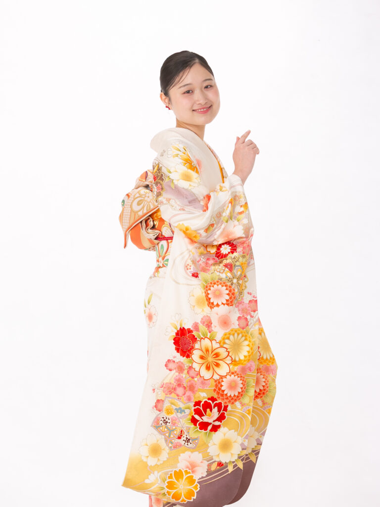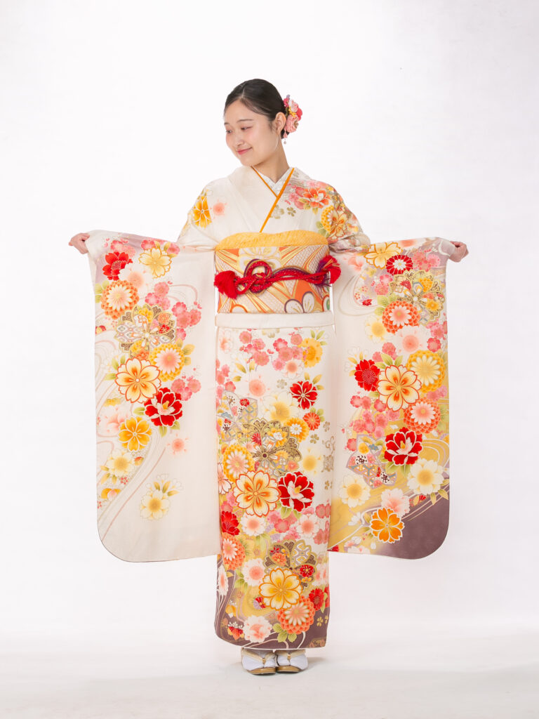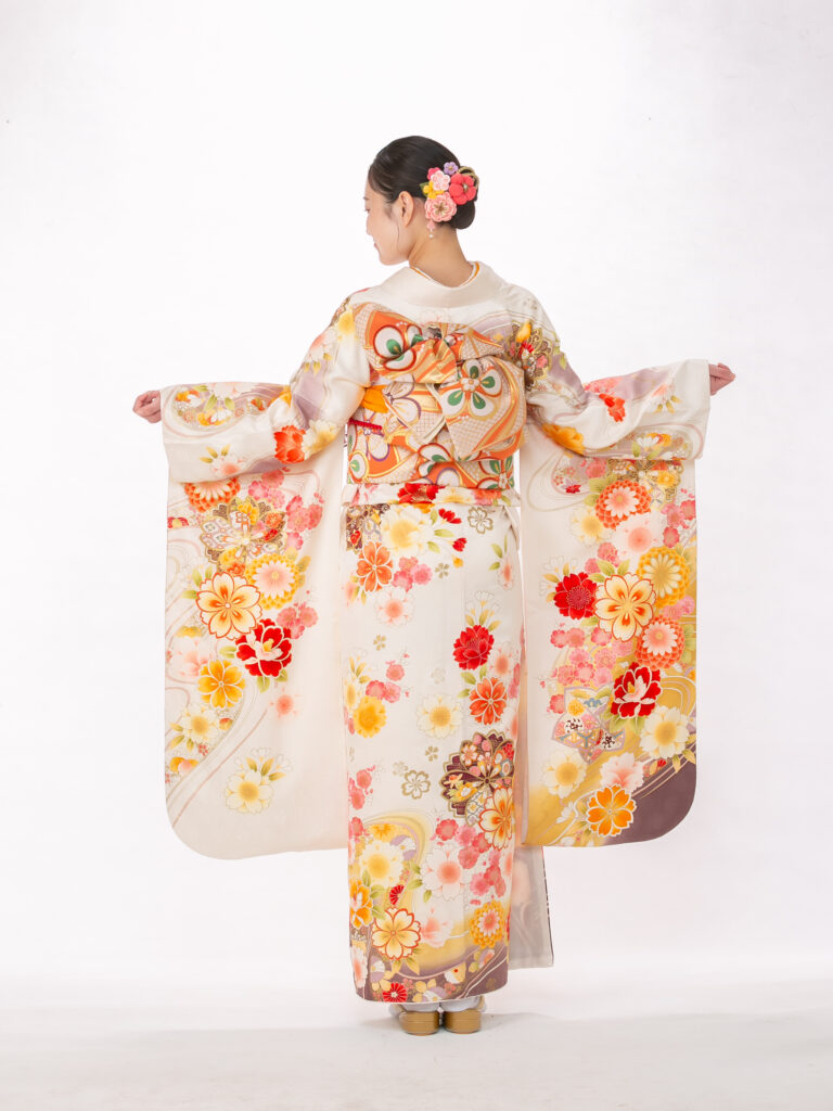オレンジやピンク系のグラデーションと、 鮮やかな花々を組み合わせた王道の振袖。 明るく可愛らしい色合いが用いられており、 地色の白との鮮やかなコントラストが魅力。