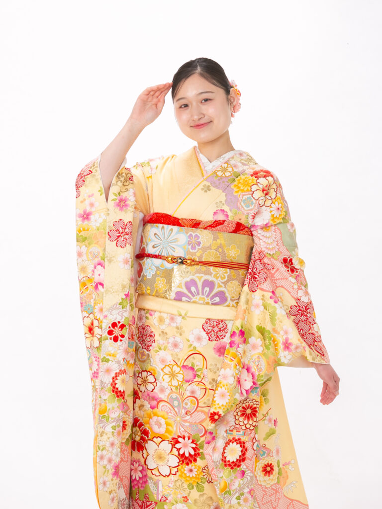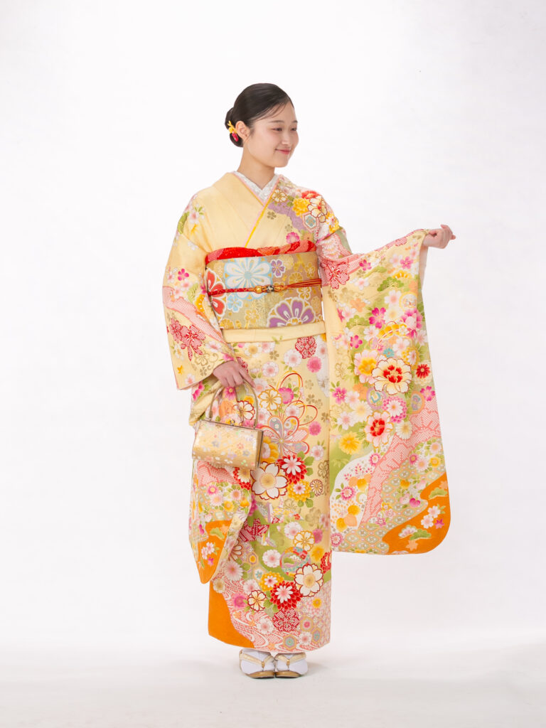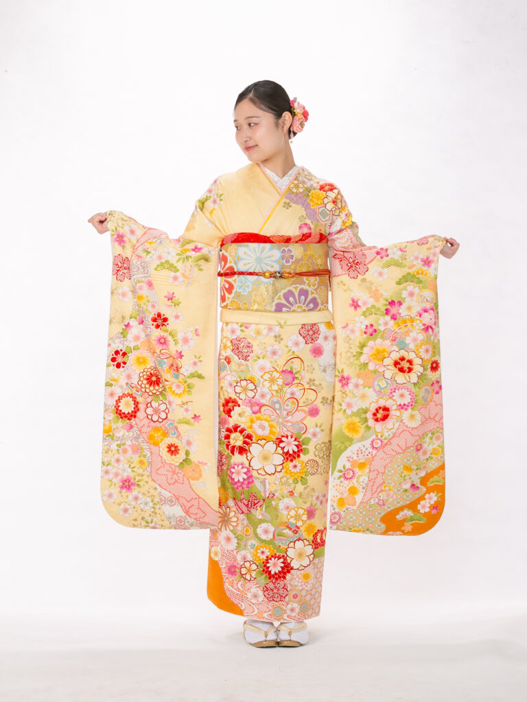 明るくフレッシュな印象の淡い黄色が 華やかで幸福感を与える振袖。 振袖全体に隙間なく様々な種類の花々が 描かれた花尽くしの総柄が目を惹きます。