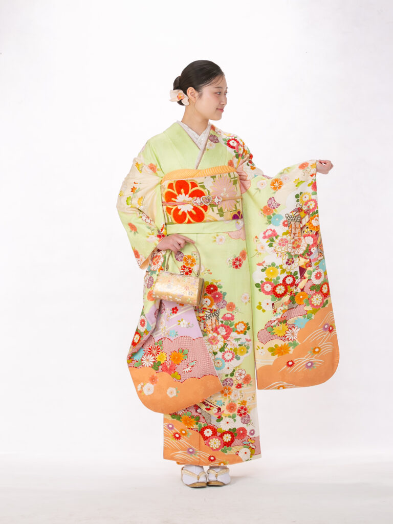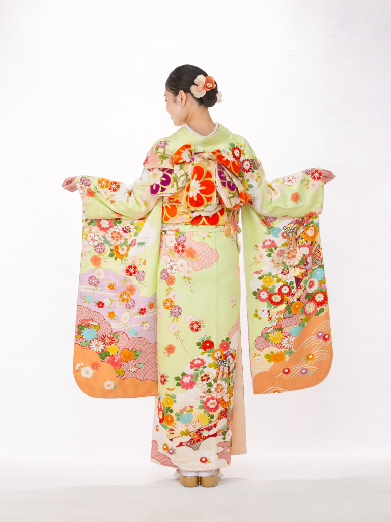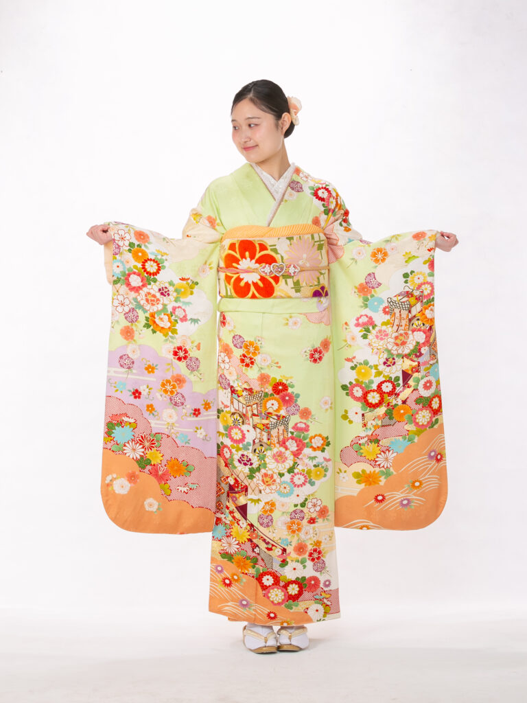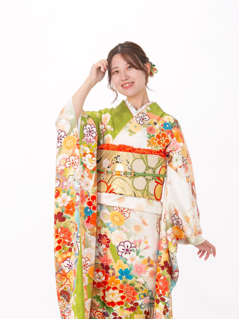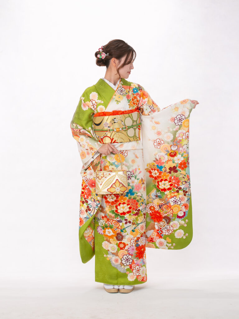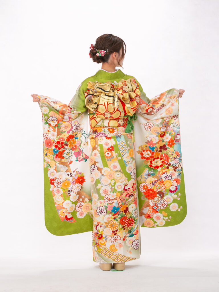目を惹く抹茶と白の染め分けに 色とりどりの花尽くしが印象的な振袖。 伝統的な文様と金彩加工が美しい 豪華で晴れの日にふさわしい一着。
