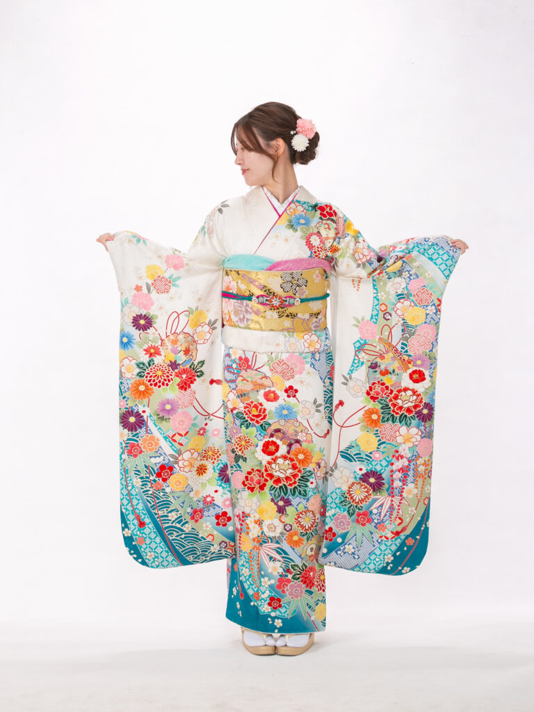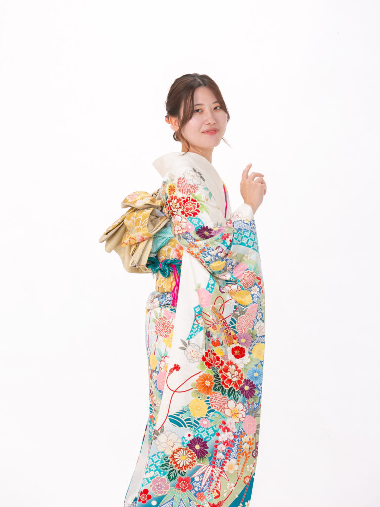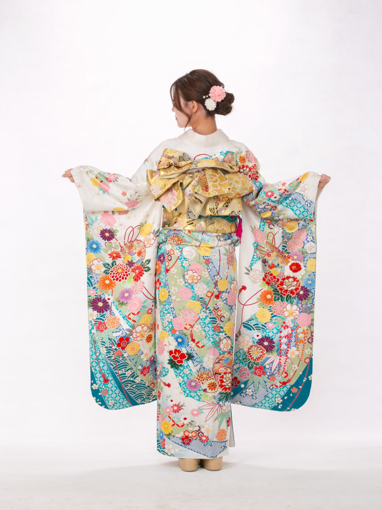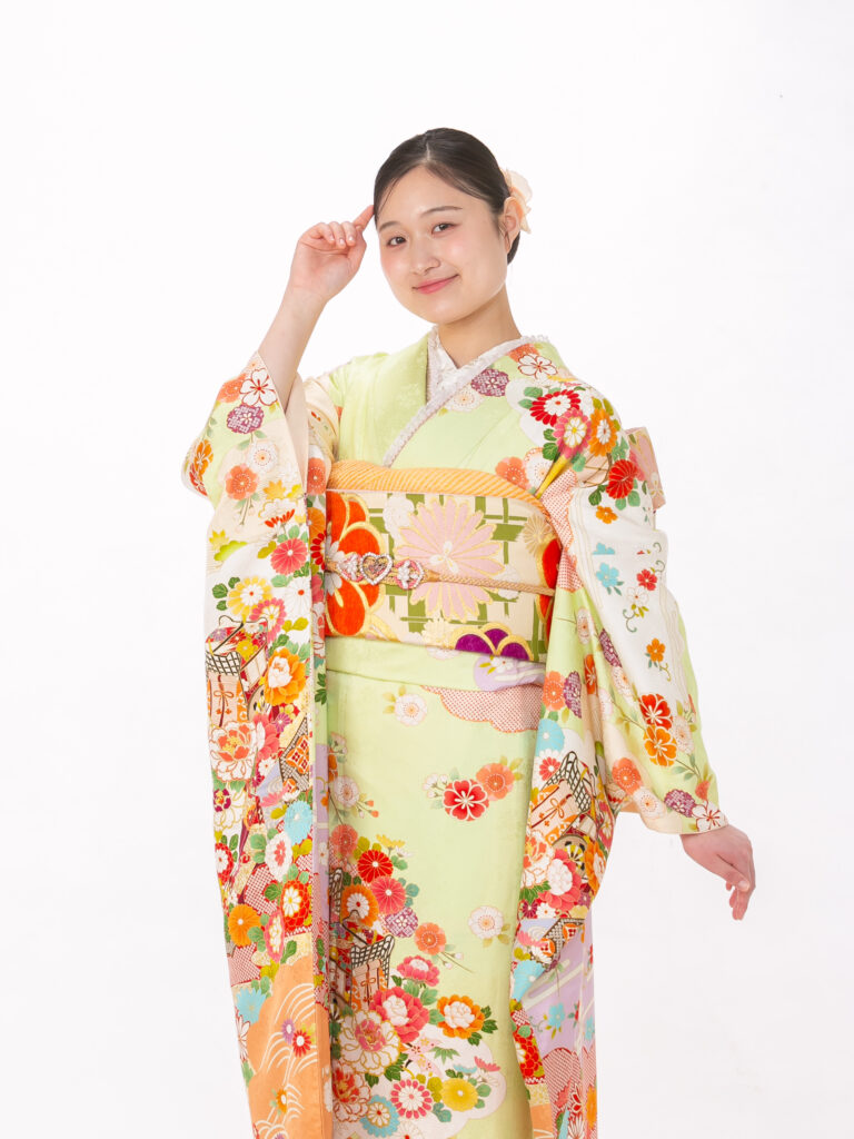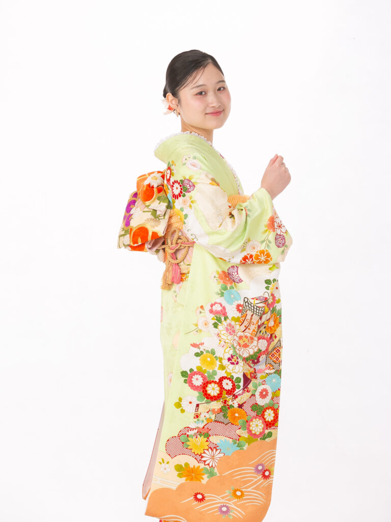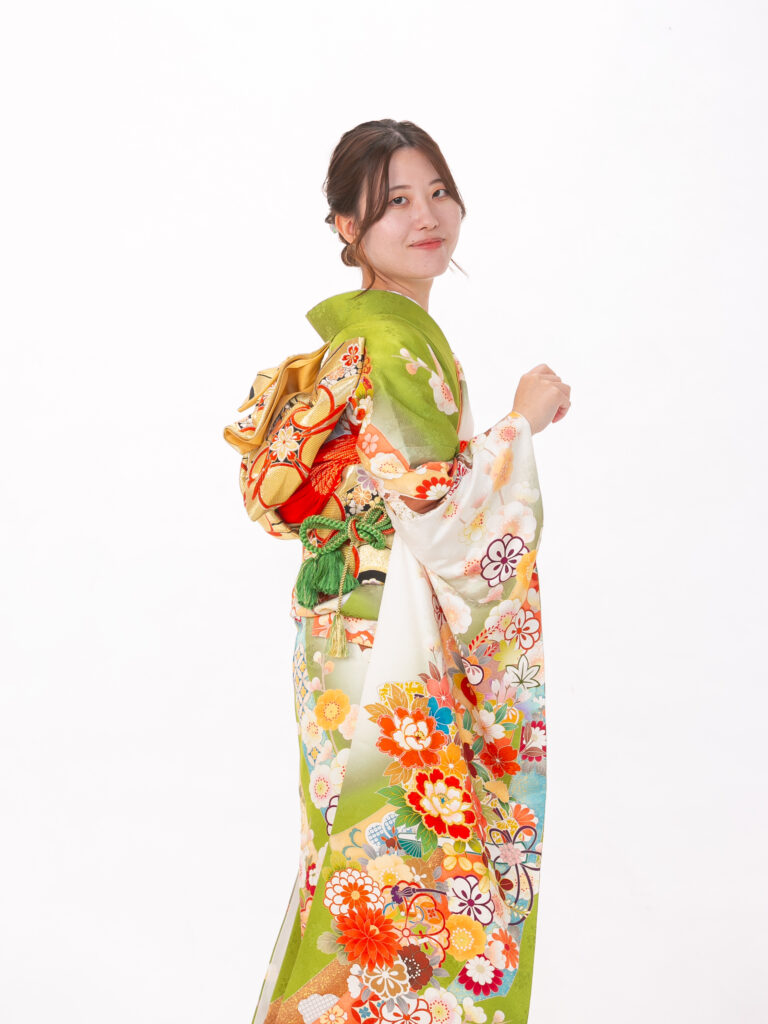 目を惹く抹茶と白の染め分けに 色とりどりの花尽くしが印象的な振袖。 伝統的な文様と金彩加工が美しい 豪華で晴れの日にふさわしい一着。