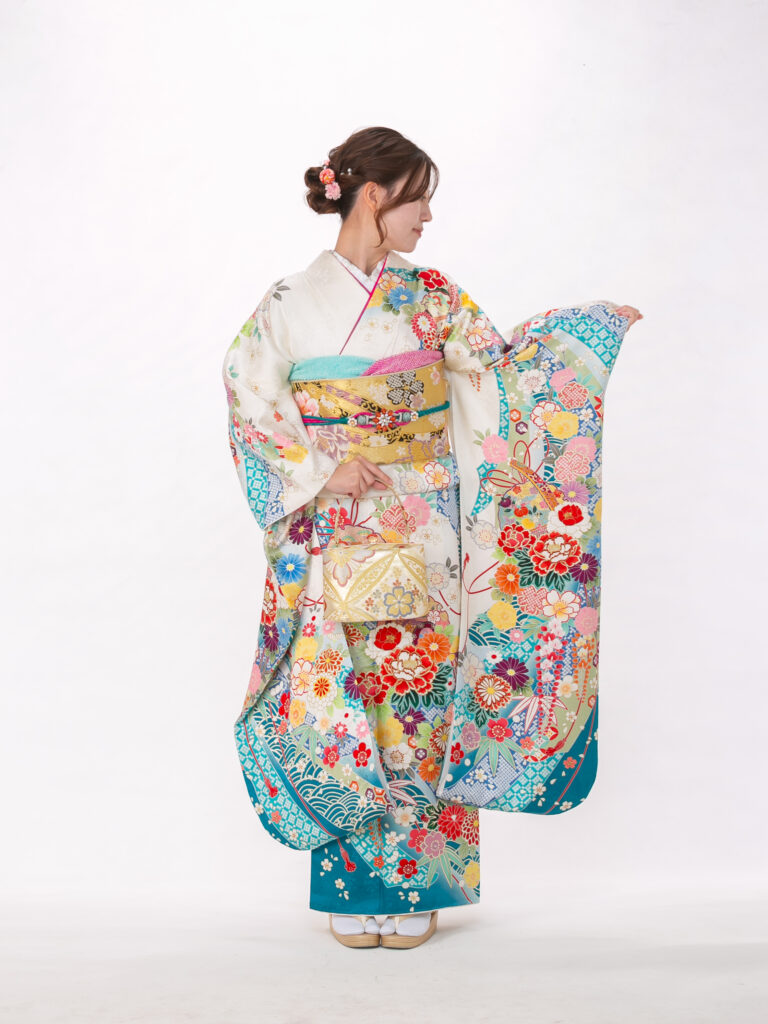 ターコイズブルーが四季の花々を惹き立てる 王道の古典柄デザインの振袖。 深い青色への美しいぼかしが入っており、 爽やかで知的な雰囲気を持ちます。