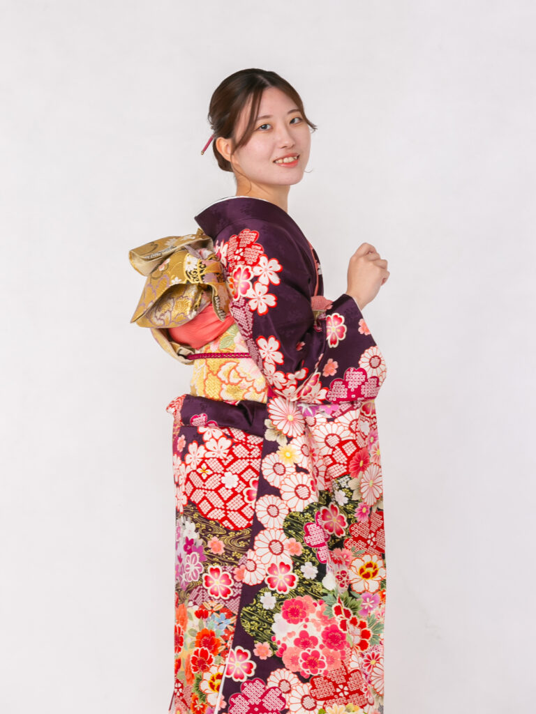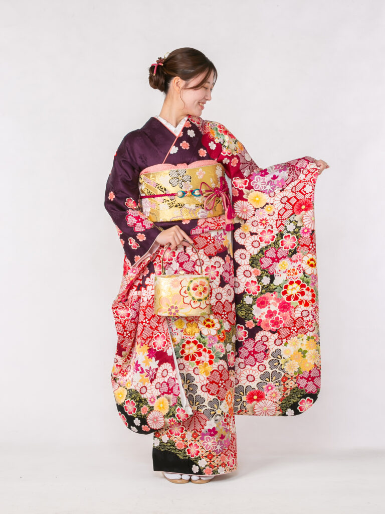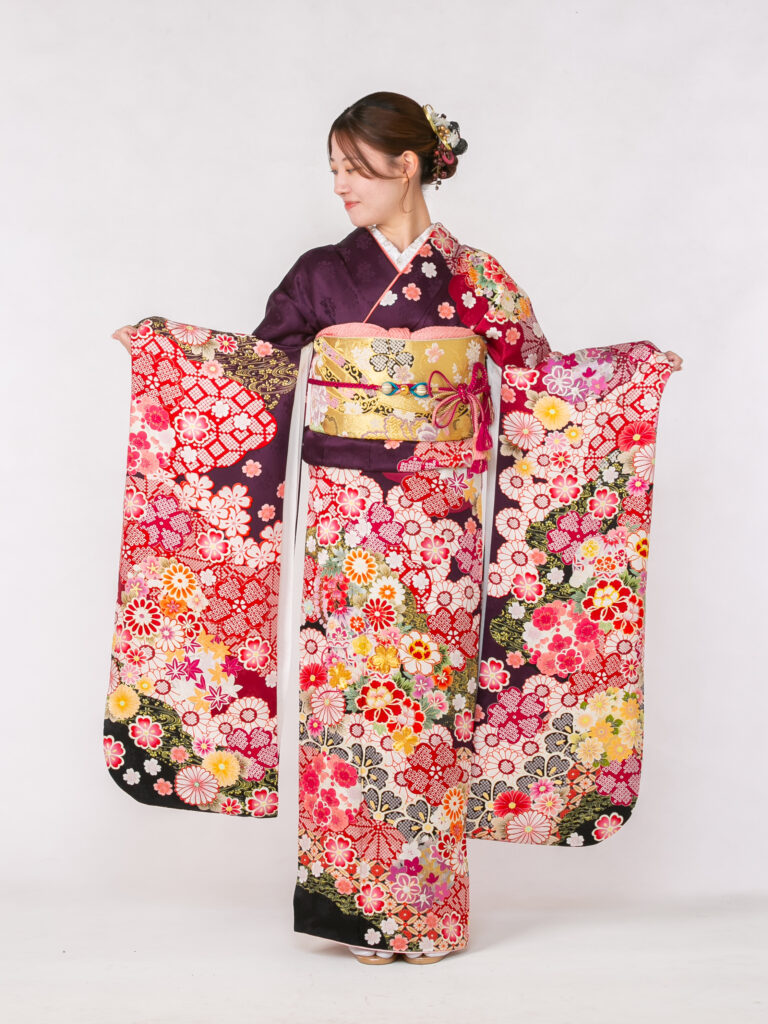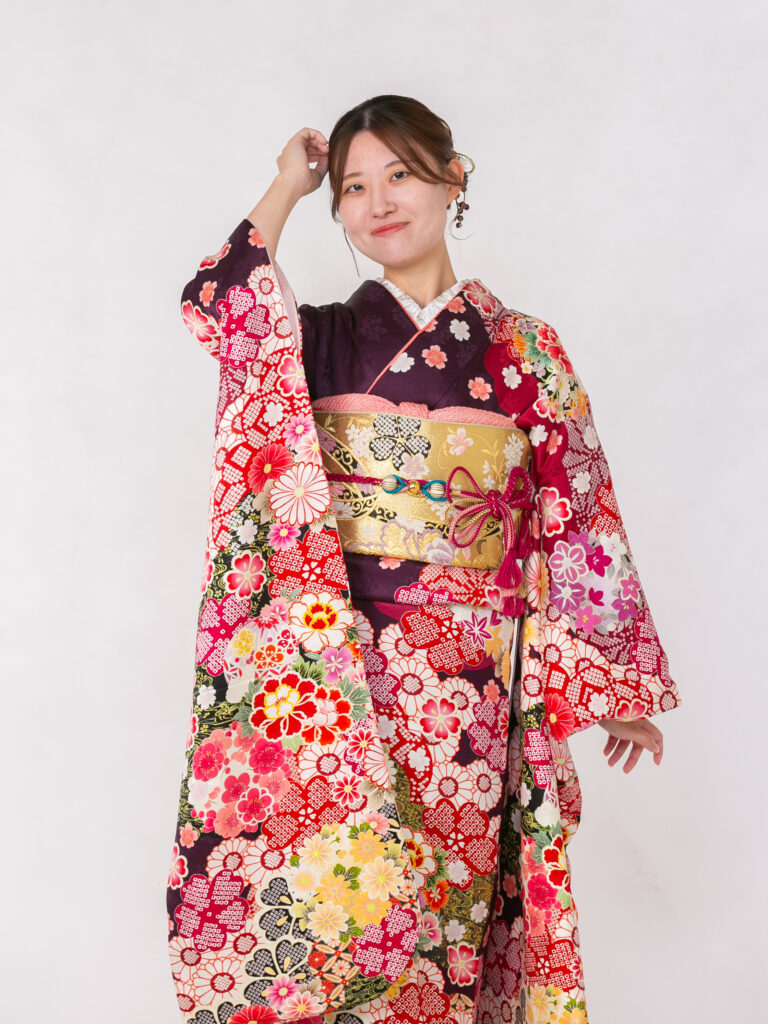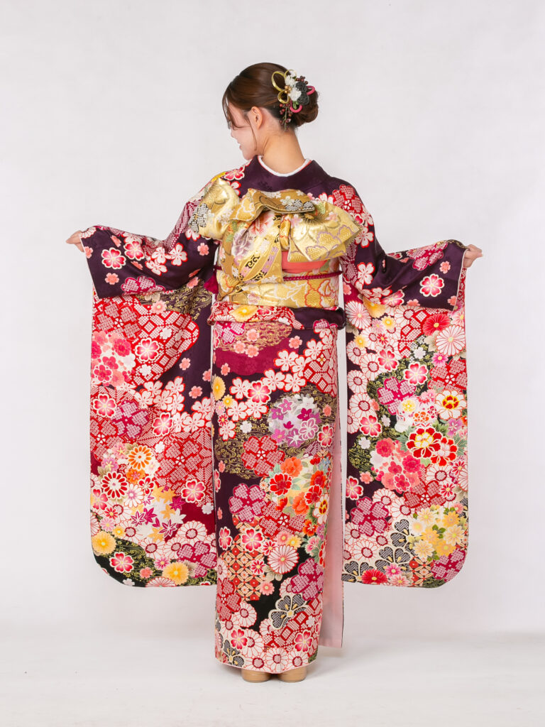 伝統的な古典柄の華やかさと、 深みのある色使いによる大人っぽい振袖。 伝統的な美しさを大切にしながらも、 現代的な配色で個性を演出します。