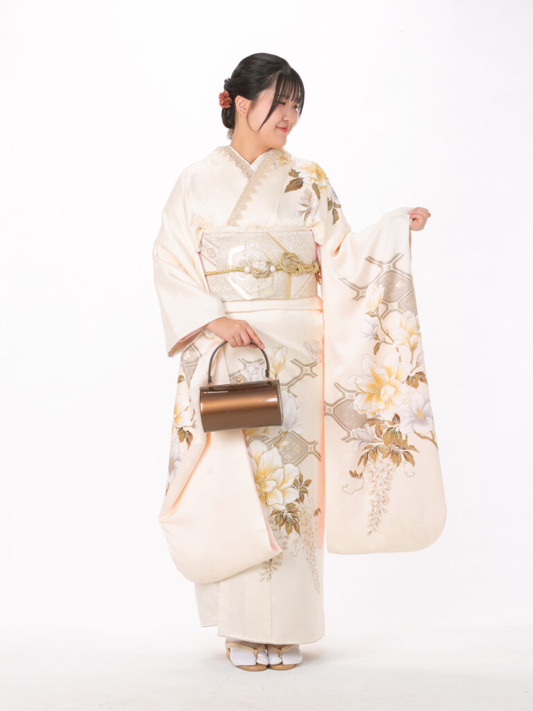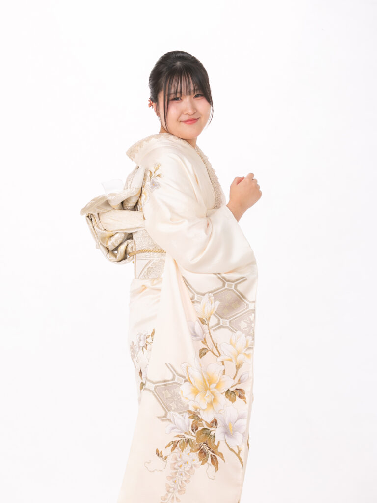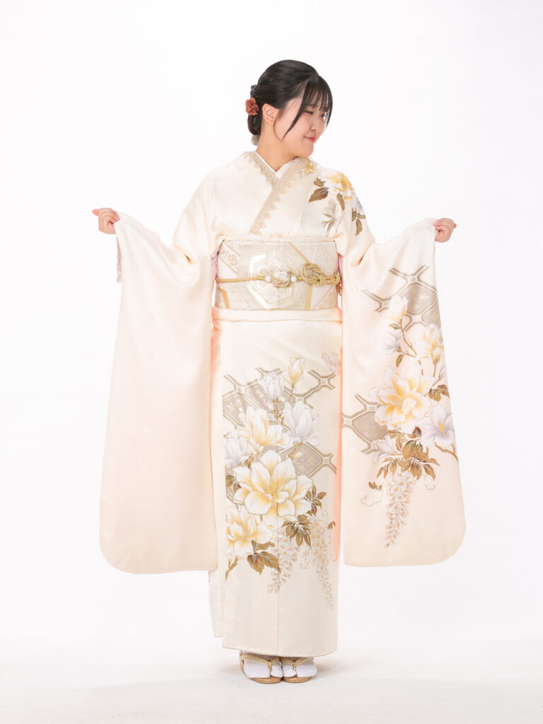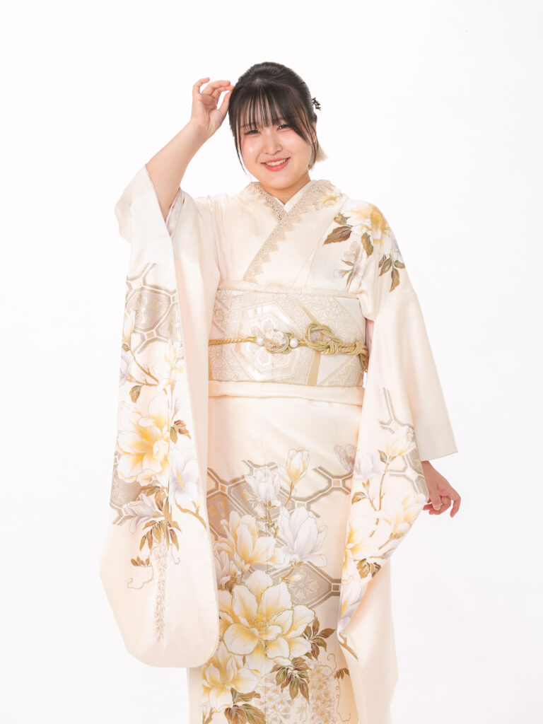 クリーム色に大ぶりの花柄が描かれた 上品でモダンなデザインの振袖。 体的に淡いトーンでまとめられており、 清楚で柔らかな印象を与えます。