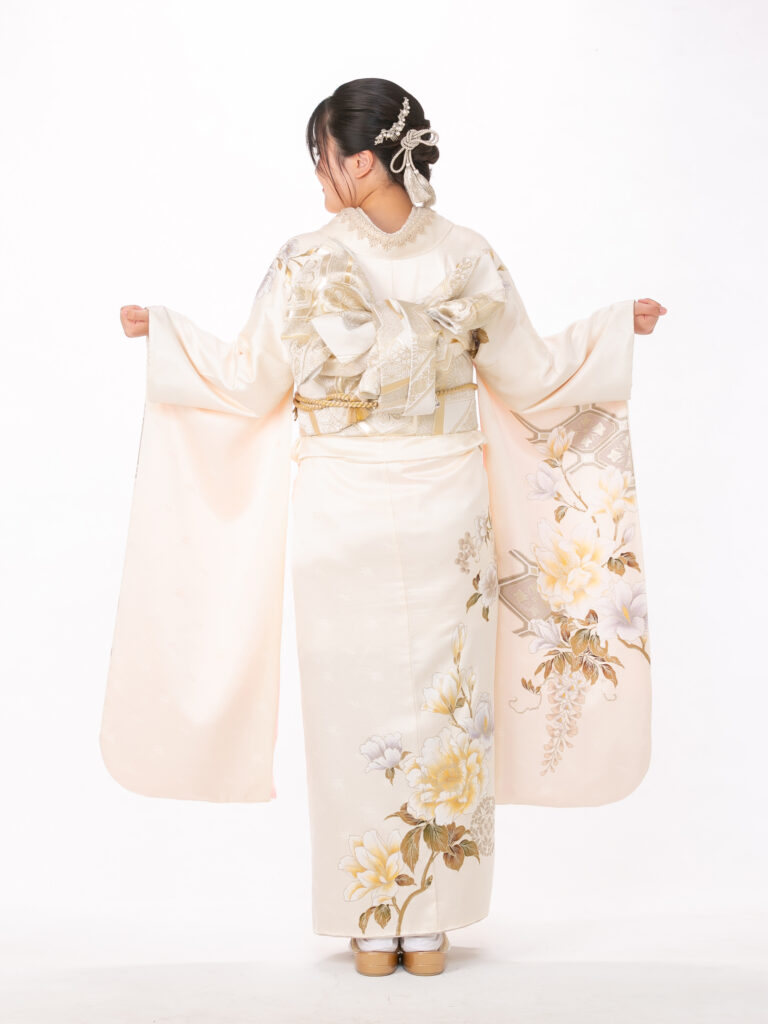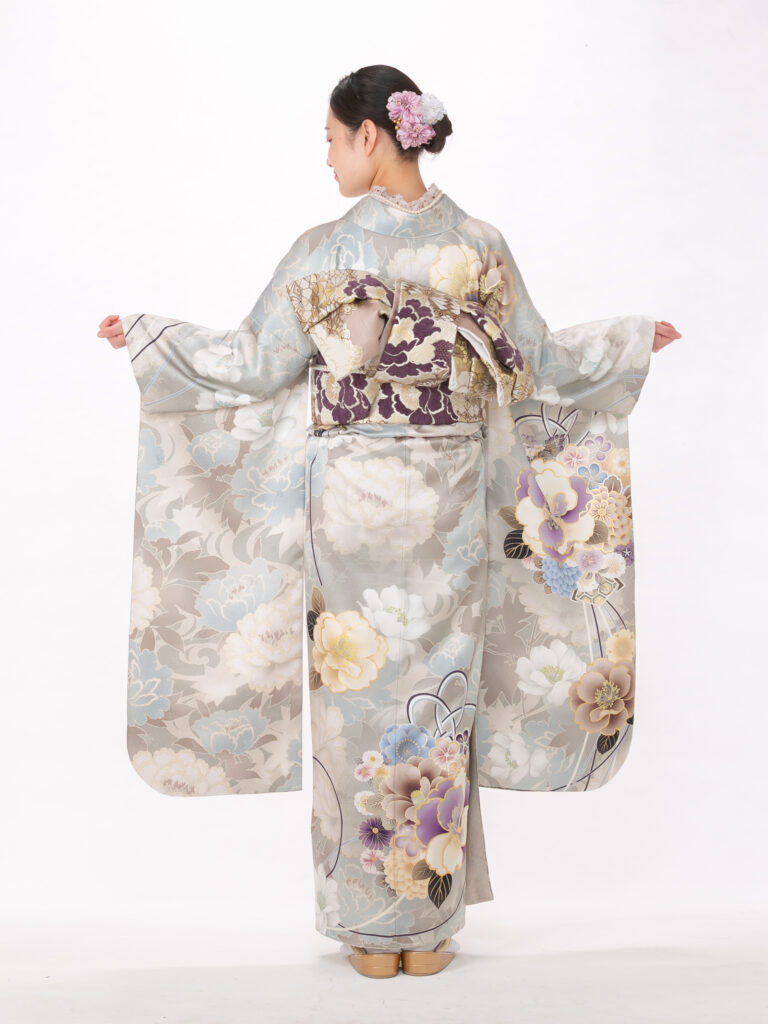 統的な着物の枠にとらわれない ペールトーンのモダンな振袖。 伝統的な花柄のモチーフを配置し 洗練されたエレガントな印象に。