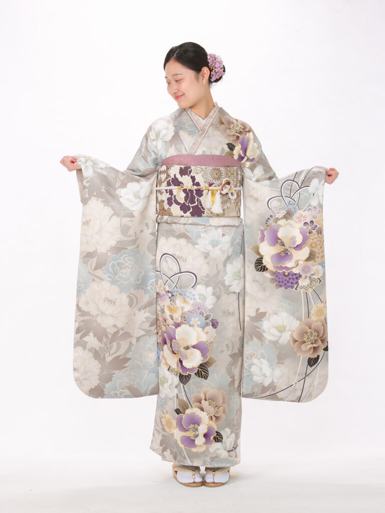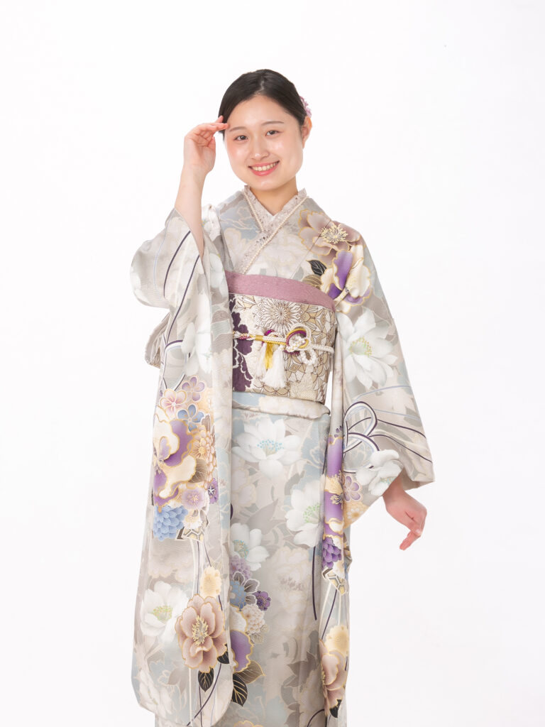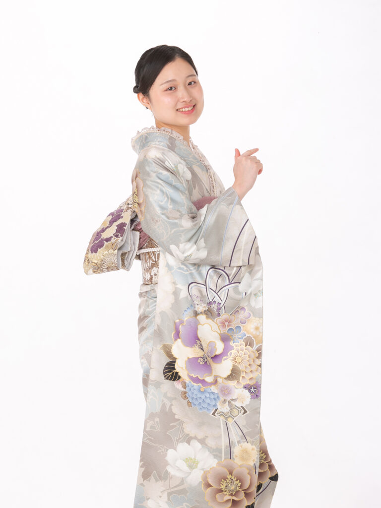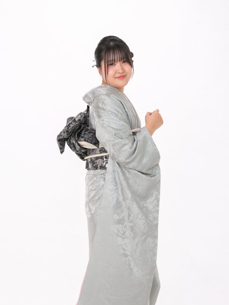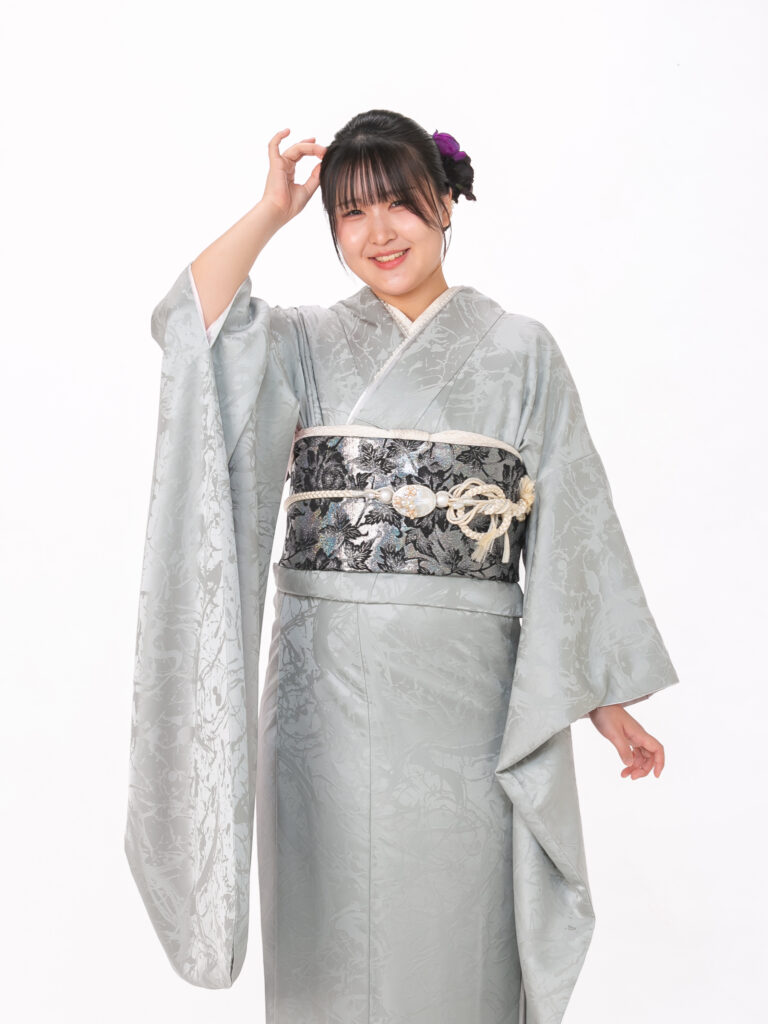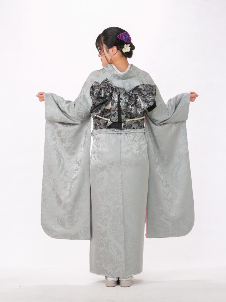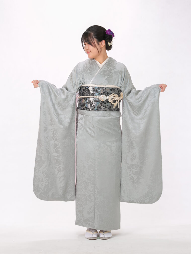 落ち着いたグレーに控えめな地模様の シックで洗練されたデザインの振袖。 シックで落ち着いた印象を与え、 大人の魅力を引き立てます。