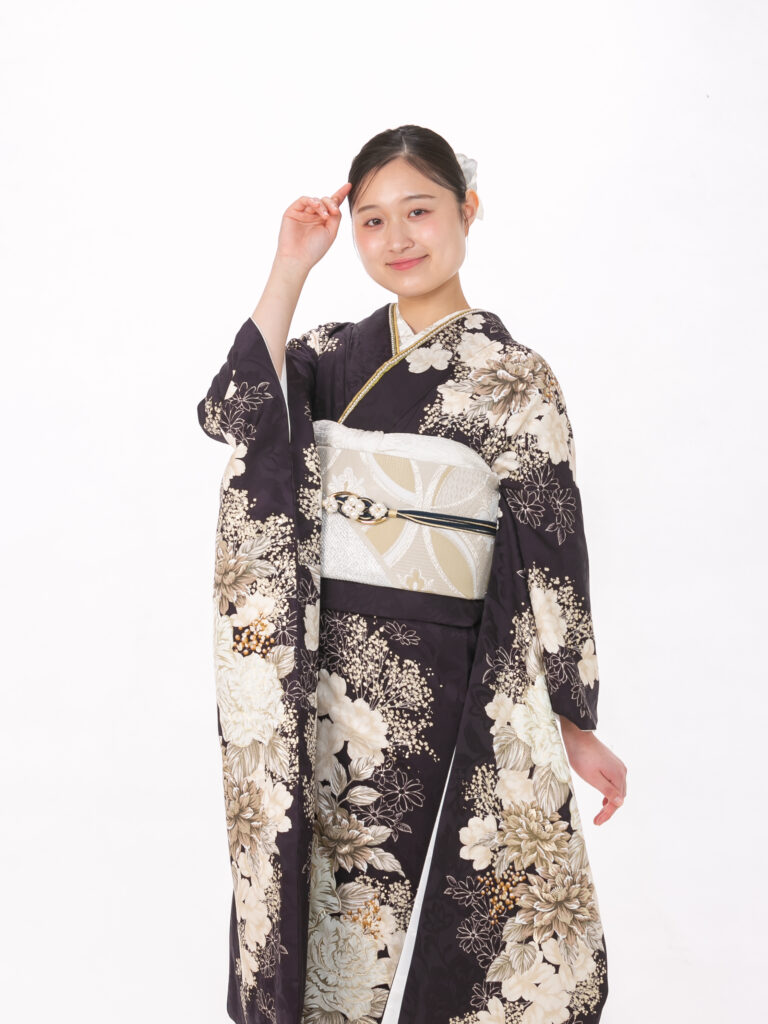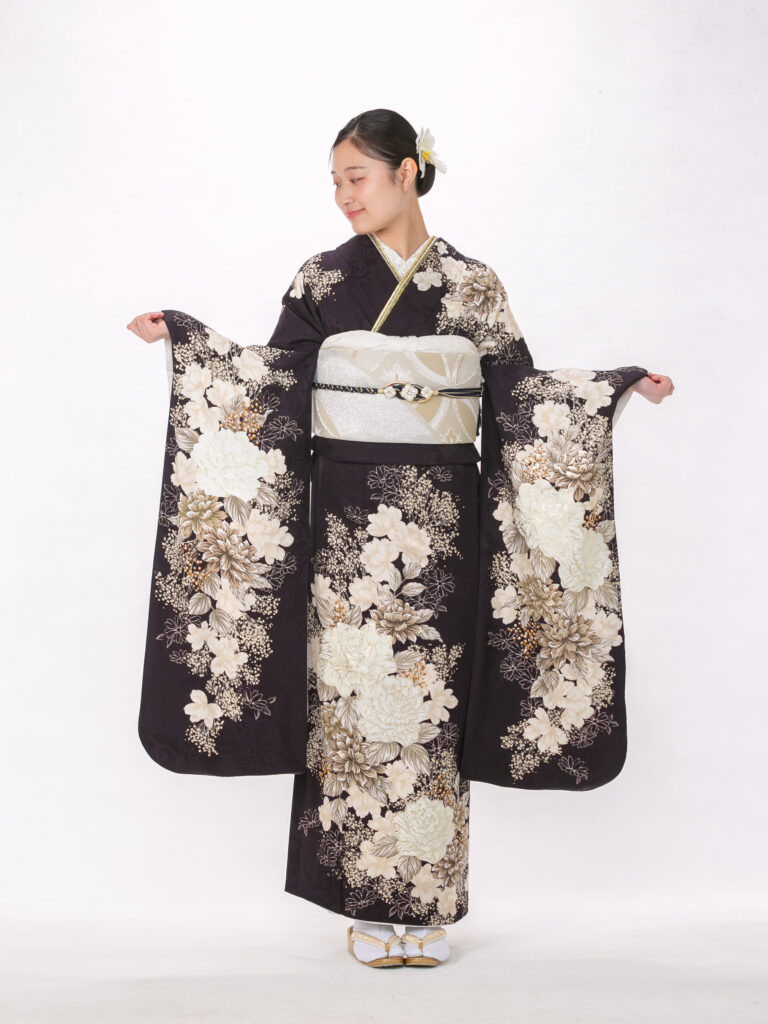 落ち着いた地色と華やかな 牡丹との対比が美しい振袖。 地色の茶色がシックであるため、 シンプルかつ圧倒的な存在感を演出。