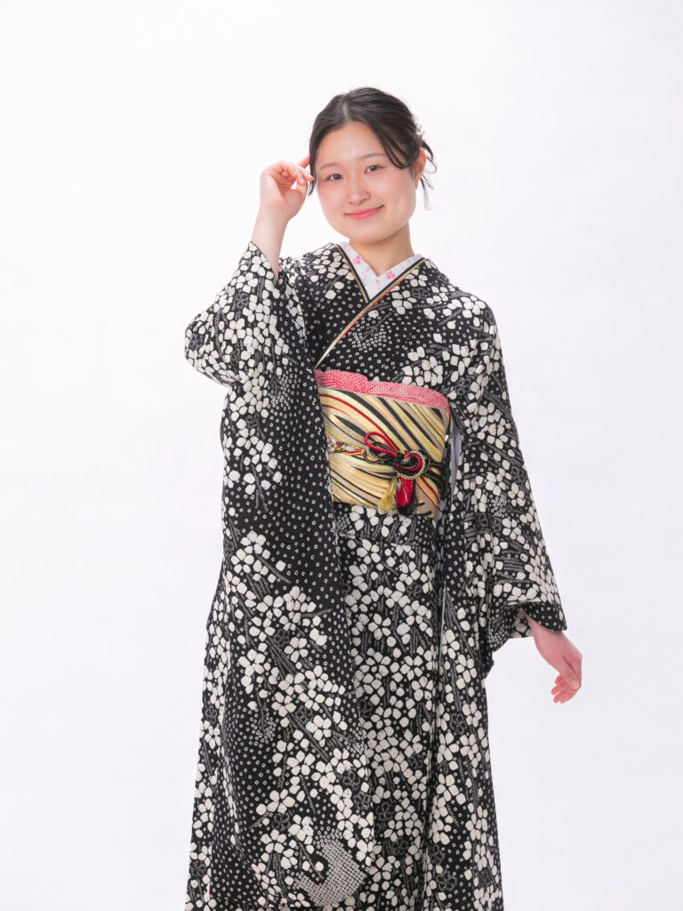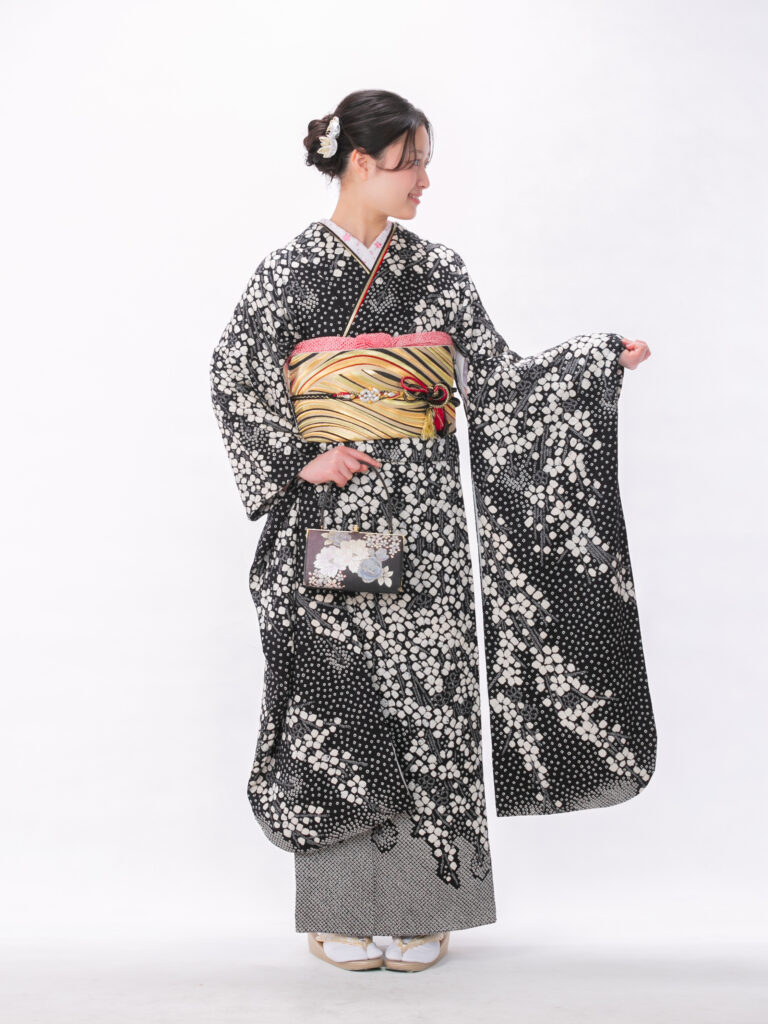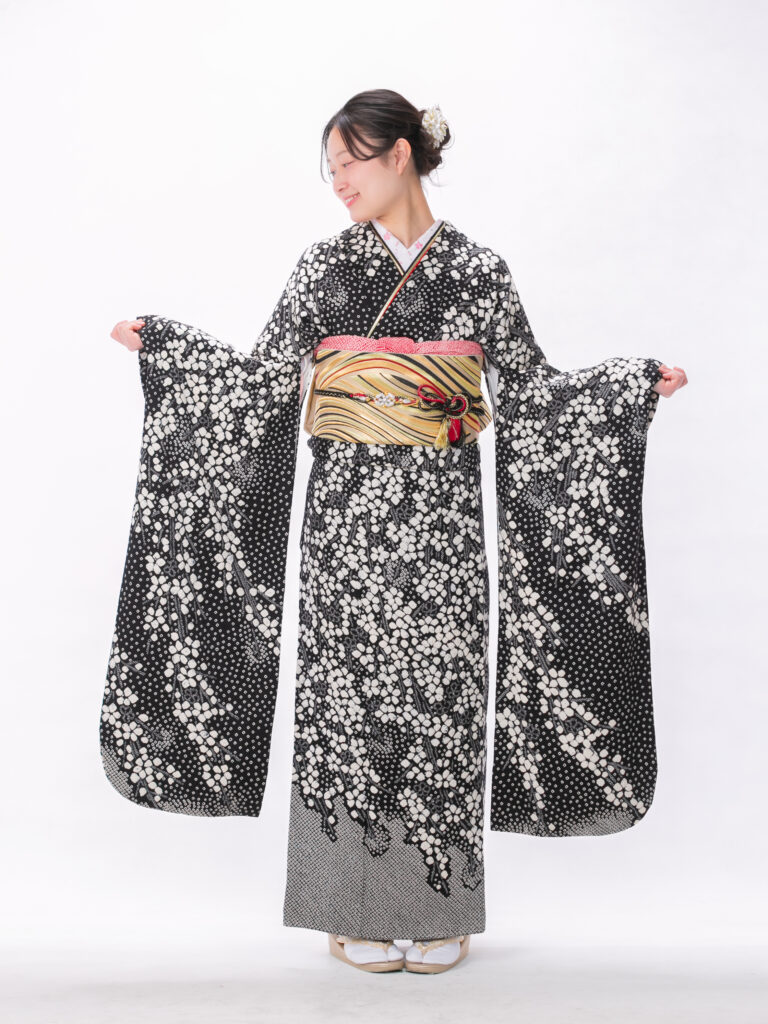 黒と白のモノトーンを基調とした モダンで洗練された雰囲気の振袖。 白い桜花が肩から裾にかけて流れる様に施され 夜桜を思わせる幻想的な美しさを演出。