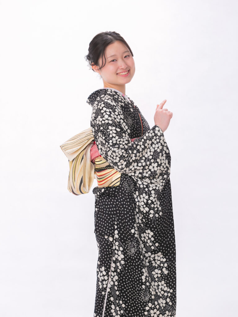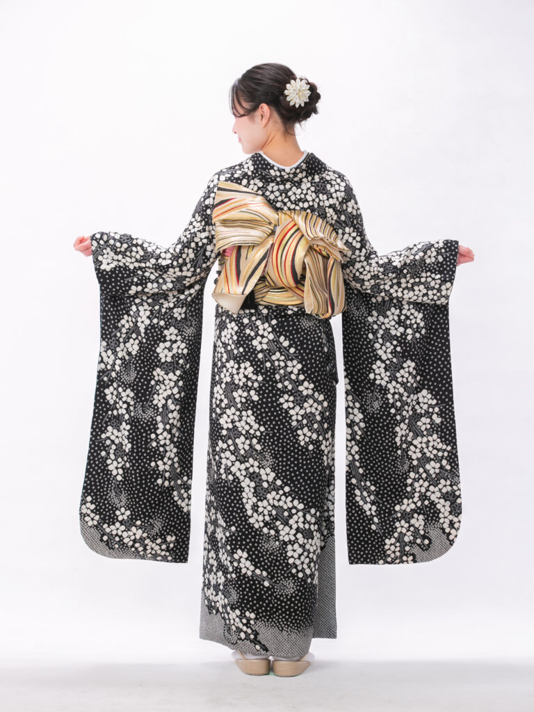 黒地にラメが施された どの角度から見ても美しい振袖。 桜や梅などの淡い花々が 春にぴったりの一枚です。